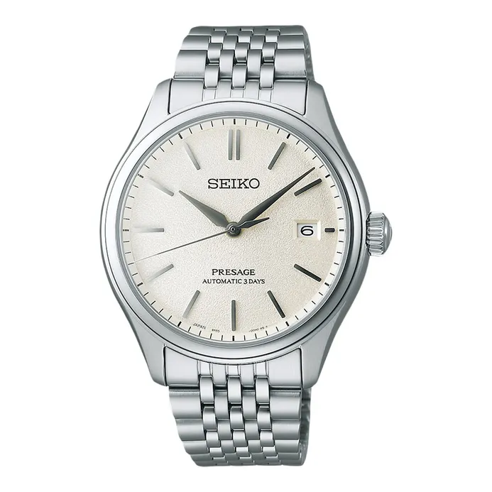 Presage Classic-serie. De Presage-collectie biedt het beste op het gebied van Japanse mechanische horlogemakerij en combineert precisietechnologie met superieur vakmanschap en design. De Presage Classic-serie is geïnspireerd op de kleuren, materialen en texturen van traditionele ambachten, waarbij elk uurwerk op elegante wijze de tijdloze schoonheid van Japan uitstraalt. De gebogen wijzerplaat van dit gestroomlijnde ontwerp, uitgevoerd in “shiro-iro”, de kleur van ongebleekte natuurlijke zijde, heeft een rijk gestructureerd patroon dat doet denken aan de glanzende stof. Tegelijkertijd vangt en reflecteert het omgevingslicht, wat een verhoogd gevoel van diepte en schoonheid creëert. Zichtbaar door de geschroefde, transparante achterkant, tikt het Seiko 6R kaliber, een automatisch uurwerk met 24 jewels, met een frequentie van 21.600 trillingen per uur, een uitzonderlijke gangreserve van 72 uur, handmatige opwinding en een datumweergave. De roestvrijstalen kast is geconstrueerd met vloeiende, gebogen oppervlakken en is voorzien van een dubbel gebogen saffierglas dat de contouren van de koepelvormige wijzerplaat volgt. De op retro geïnspireerde armband met meerdere rijen schakels en gebogen bovenvlakken zorgt voor een uiterst slanke en comfortabele pasvorm en is voorzien van een vouwsluiting met drukknop. Waterdicht tot 10 bar en 100 meter.