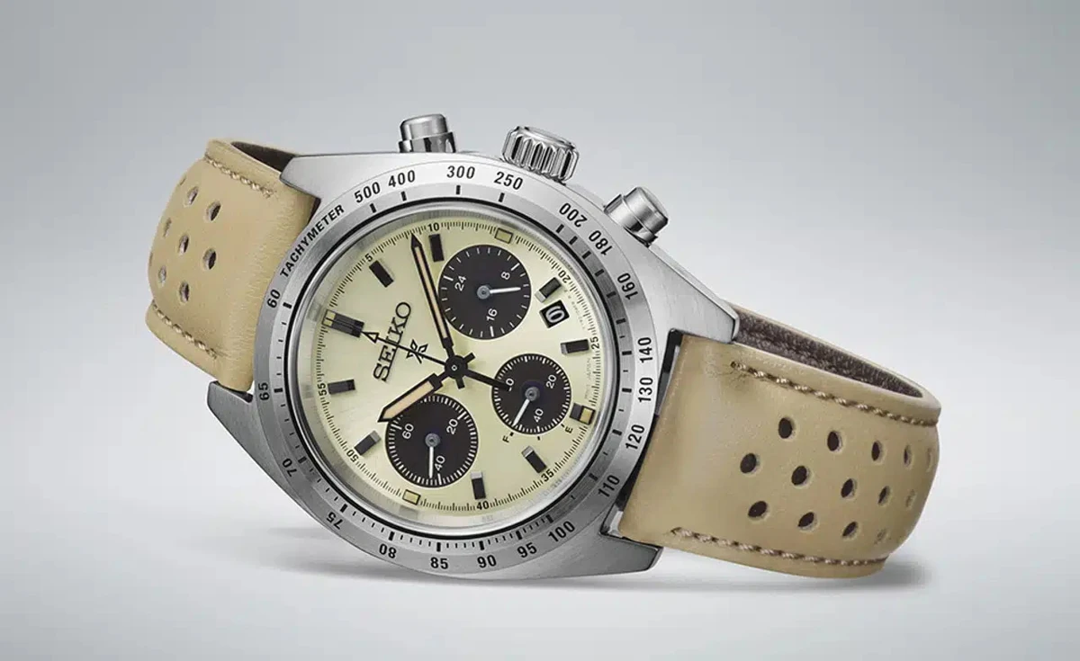 De Seiko Prospex SSC959P1 Limited Edition Speedtimer Solar Motoring chronograaf is een exclusieve European Limited Edition 2025, waarvan slechts 3.000 stuks verkrijgbaar zijn, uitsluitend in Europa. Dit model is geïnspireerd op de elegantie van klassieke Europese sportwagens en combineert vintage charme met moderne technologie. Onder het gebogen saffierglas bevindt zich een crèmekleurige wijzerplaat met een subtiel zonnestraalpatroon, dat de luxe uitstraling van klassieke auto-interieurs oproept. De zwarte subdials zorgen voor een krachtig contrast en verwijzen naar het geliefde ‘Panda’-ontwerp van de eerdere SSC813. Het horloge wordt geleverd met een extra lichtbruine geperforeerde leren band, geïnspireerd op de stijlvolle lederen bekleding van historische sportauto’s. De Speedtimer SSC959 wordt aangedreven door het Seiko kaliber V192, een betrouwbaar solar-uurwerk dat zowel natuurlijk als kunstmatig licht gebruikt om op te laden. Volledig opgeladen heeft het horloge een gangreserve van ongeveer zes maanden en een nauwkeurigheid van ±15 seconden per maand. De chronograaffunctie meet verstreken tijd tot zestig minuten in stappen van een vijfde seconde en biedt daarnaast een datumweergave, power reserve-indicator, 24-uurswijzer, kleine secondewijzer en overlaadbeveiliging. De roestvrijstalen kast heeft een diameter van 39 millimeter, een dikte van 13,3 millimeter en een lug-to-lug lengte van 45,5 millimeter. Het gebogen saffierglas met anti-reflecterende coating aan de binnenzijde garandeert uitstekende leesbaarheid, terwijl LumiBrite op wijzers en indexen zorgt voor helderheid in het donker. De kast is waterdicht tot 10 ATM en uitgerust met een schroefdeksel waarop “Limited Edition” en een uniek serienummer zijn gegraveerd. Een tachymeterfunctie maakt het ontwerp compleet.