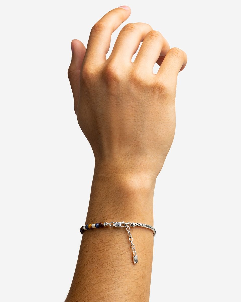 Laat je betoveren door onze nieuwe Spirit Bead Stacking Armbanden! De Spirit Bead Stacking Armband Zilver Tiger Eye Sodalite wordt gekenmerkt door 4mm Gemstone Spirit Beads en een elegante compositie van verfijnde zoetwaterparels, 925 sterling zilveren George Beads en het kenmerkende George Mini-vlechtwerk. Specifiek ontworpen met kleinere Gemstone Beads en subtiel verstelbaar dankzij de hoogwaardige karabijnsluiting, voor een perfecte, unisex pasvorm bij elke pols. De armband is geïnspireerd door Balinese bidkralen en heeft helende werkingen. Zo bevordert Tiger Eye innerlijke kracht en zelfvertrouwen, helpt het bij het nemen van beslissingen en biedt het bescherming tegen negatieve invloeden. Sodalite staat bekend om zijn kalmerende energie, versterkt het zelfinzicht en bevordert harmonie tussen gevoel en verstand. Edelstenen zoals Tiger Eye en Sodalite zijn natuurproducten en kunnen gevoelig zijn voor harde stoten, water en chemische middelen. Vermijd contact met parfum, schoonmaakmiddelen of langdurige blootstelling aan zonlicht om de kleur en glans te behouden. Wie ga jij verrassen met deze Spirit Bead Stacking Armband?