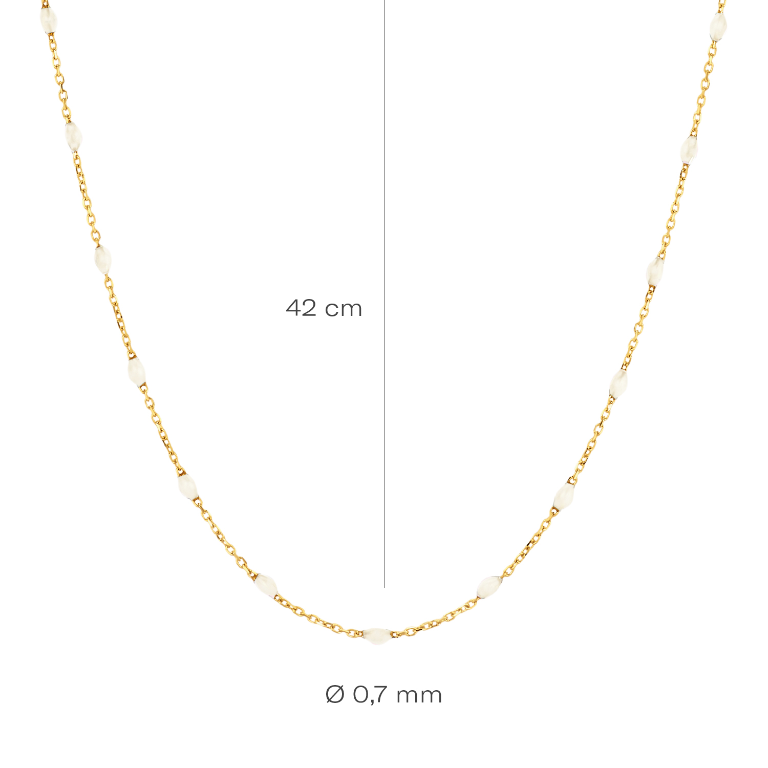 Melkwitte resin stenen maken dit 14k geelgouden collier met veerringsluiting tot een subtiele eyecatcher. Heel mooi op zichzelf of in combinatie met andere sieraden met resin uit onze collectie, bijvoorbeeld armband 2226YRM.