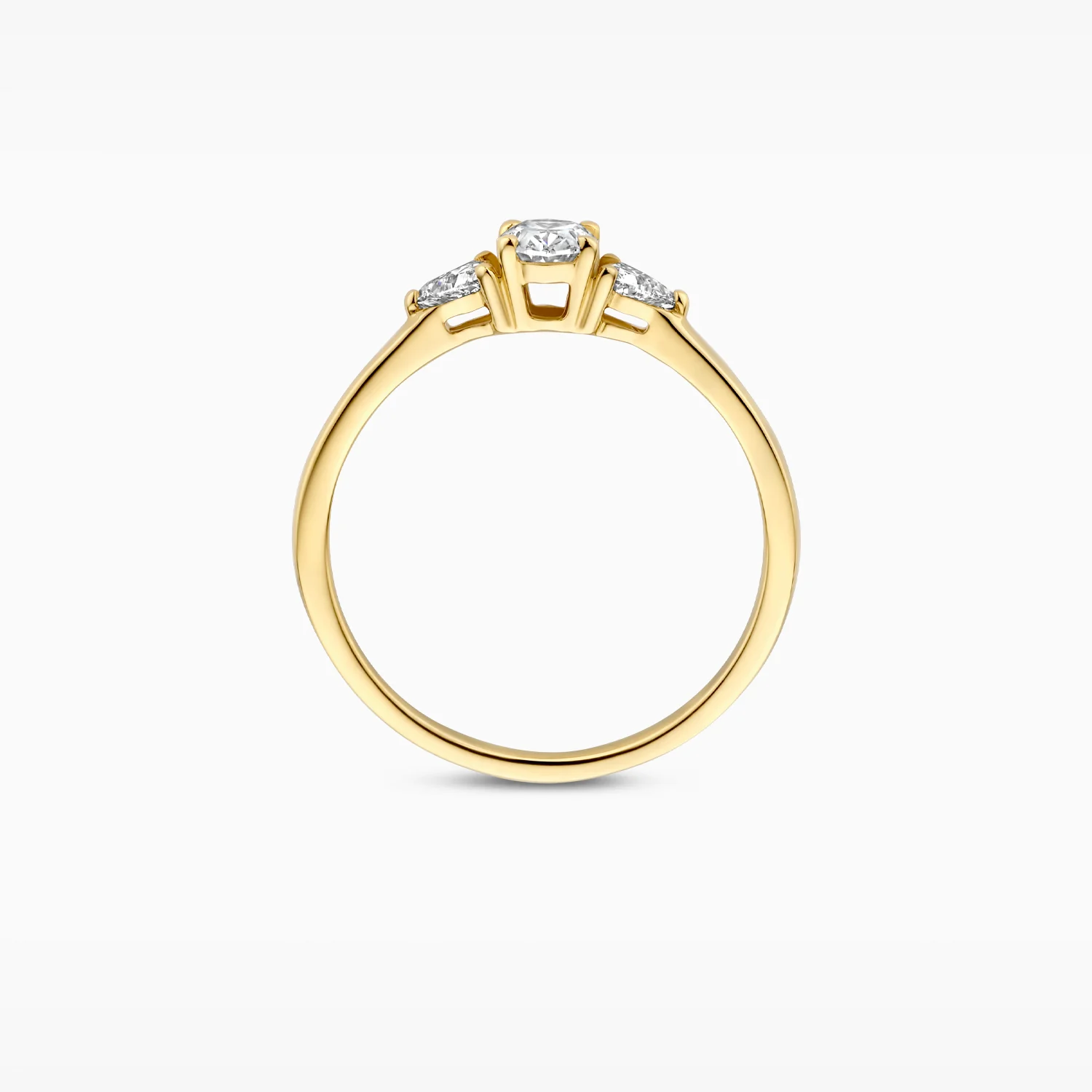 Met zijn fantasievolle ontwerp is deze 14k geelgouden ring een echte blikvanger. De drie lab-diamonds in ovale en driehoekige vorm trekken gegarandeerd de aandacht. Het totaal karaatgewicht van de diamantjes is 0,55 en de doorsnede van de band is 1,5 mm.