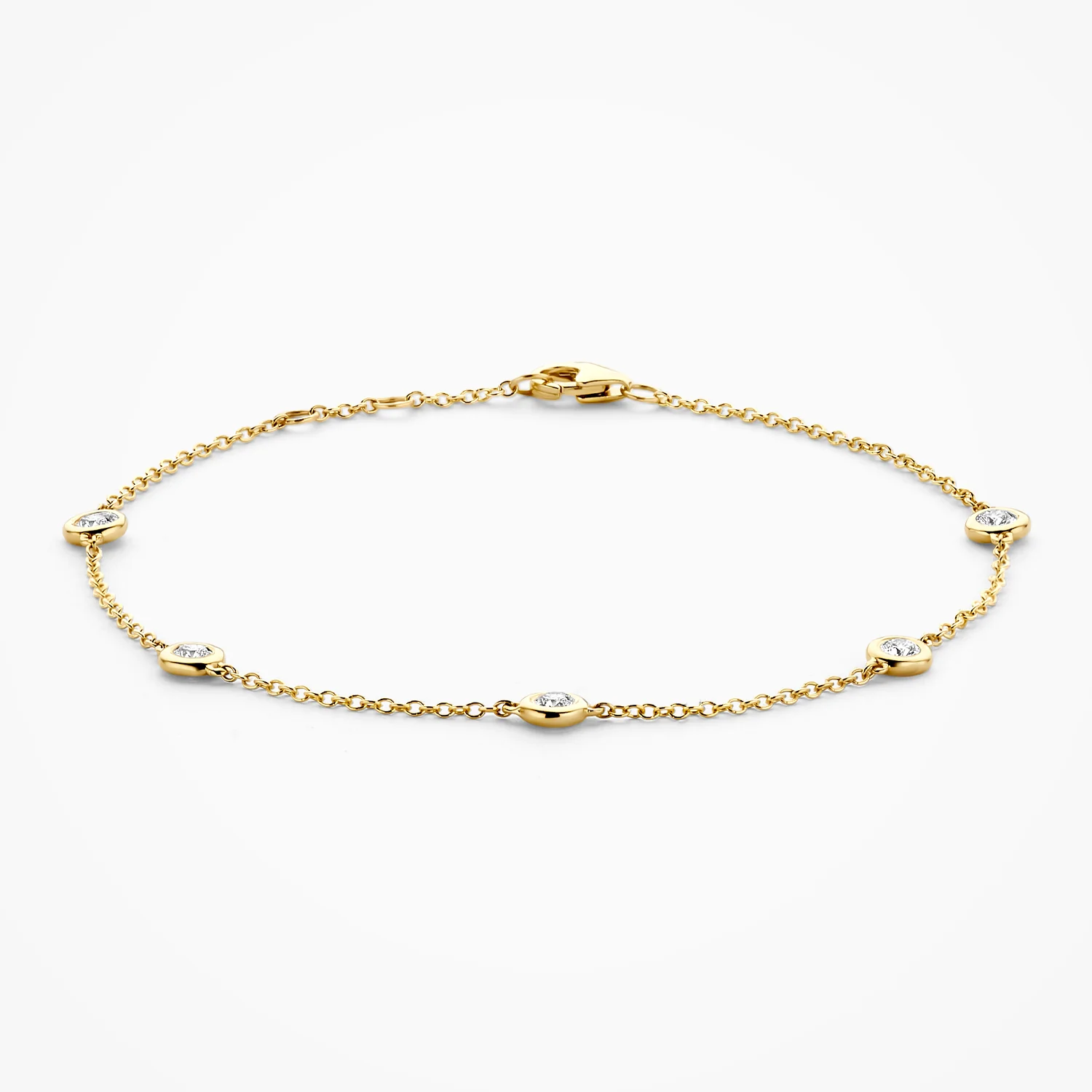 Deze verfijnde 14k geelgouden armband met ankerschakels en vijf lab-diamonds in gladomzetting trekt meteen de aandacht. De lengte is 17,7-18 cm en het totale karaatgewicht 0,37. Een eyecatcher op zich maar ook prachtig te mixen en matchen met andere armbanden uit onze collectie.