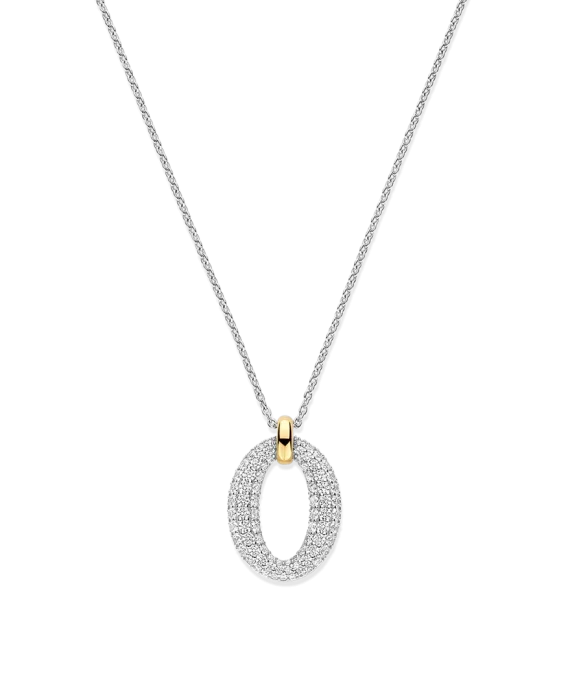 Deze TI SENTO ketting 34092ZY trekt alle aandacht. Gemaakt van 925 sterling zilver en afgewerkt met een stralende platinakleurige laag, straalt deze ketting tijdloze elegantie uit. Het middelpunt is een verbluffende ovaalvormige hanger, bezet met schitterende cubic zirconia stenen. Elke steen is zorgvuldig geplaatst voor een oogverblindende schittering, waardoor deze ketting een echt statement van verfijnde elegantie is. De hanger hangt elegant aan een delicate zilvergekleurde ketting met een geelgoud gekleurde clip-oog, wat een vleugje warmte en verfijning toevoegt aan het ontwerp. Met zijn klassieke silhouet en luxueuze details straalt dit sieraad verfijning en charme uit, perfect om zowel dag- als avondlooks te verrijken. Of je de ketting nu in laagjes draagt voor een moderne twist of solo als een gedurfd statement, deze ketting belooft een vleugje gratie en individualiteit aan je stijl toe te voegen. Zorgvuldig vervaardigd voor de gevoelige huid, biedt deze nikkelvrije en hypoallergene ketting langdurig comfort en kwaliteit.
